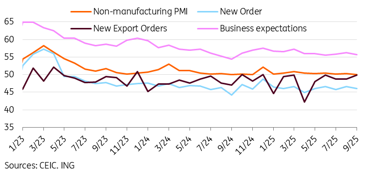 Less encouraging was the ex-factory price slump to 48.2, which remained in contraction territory for the 16th consecutive month and hit a three-month low. It signals that “anti-involution” efforts against aggressive price competition have yet to have a significant impact on prices.