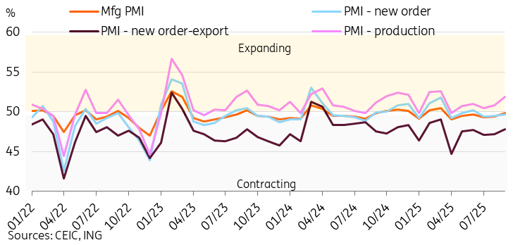 Overall, the data breakdown is generally encouraging. Production increased to 51.9, also reaching a six-month high. New orders remained in contraction but edged up 0.2pp to 49.7. New export orders also rebounded to a six-month high of 47.8. Employment reached a seven-month high of 48.5.