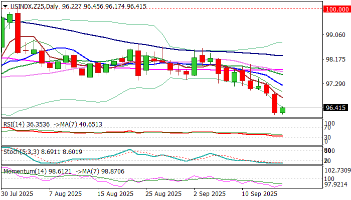 Bears eye key support at 95.97 (2025 low, posted on July 1), loss of which will confirm a completion of 95.97/100.04 corrective phase and signal continuation of larger downtrend and expose immediate target at 95.18 (Fibo 76.4% of 89.15/114.72 uptrend.