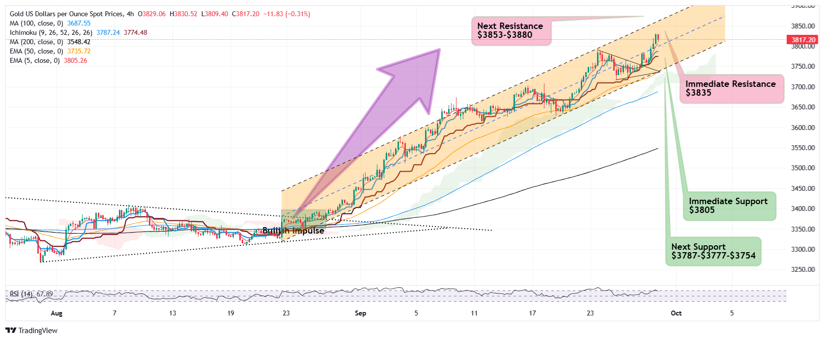 Gold is in a strong bullish momentum and current strong surge keeps updating new record high prices every now and then. There is no significant price correction or pullback as of now and the metal continues to trade above all major moving averages as well as momentum indicators favouring strong trend continuation that keeps chances valid for further gains to $3880 if bulls succeed turning $3830 into a support with prices closing the day above the zone.